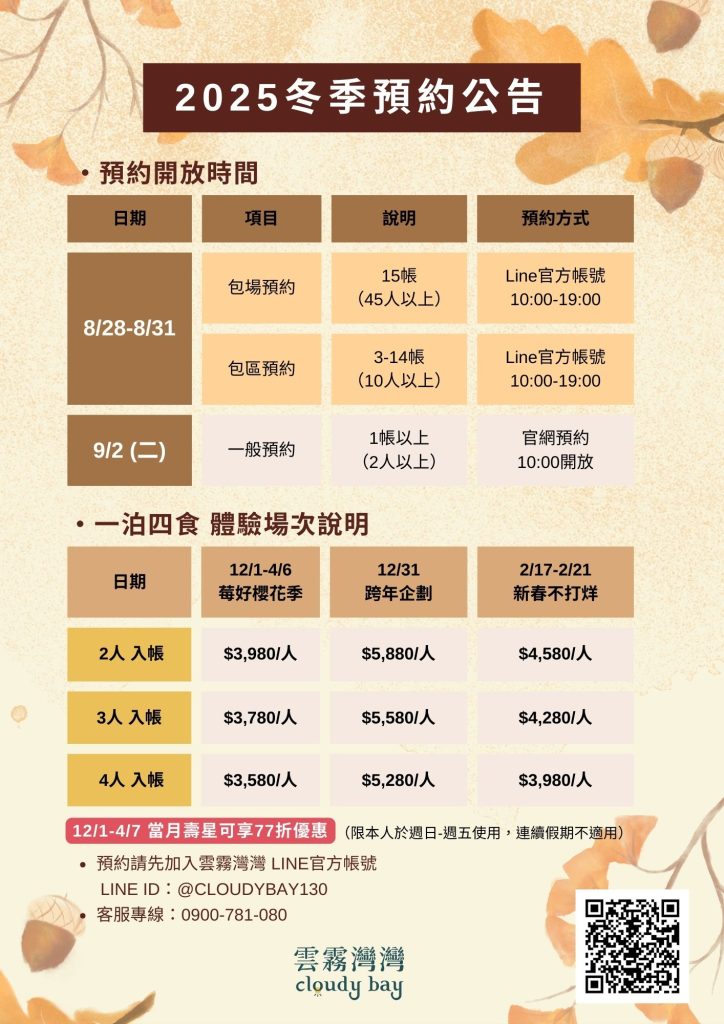 2. 預定後,請務必加入line官方帳號 @cloudybay130與我們聯繫,確認無誤後,請於24小時內付款完成,以利帳位保留,並請匯款完成後告知帳號末五碼。由於一泊四食體驗內容需要提前客製準備,所以目前僅接受全額匯款預定,謝謝。